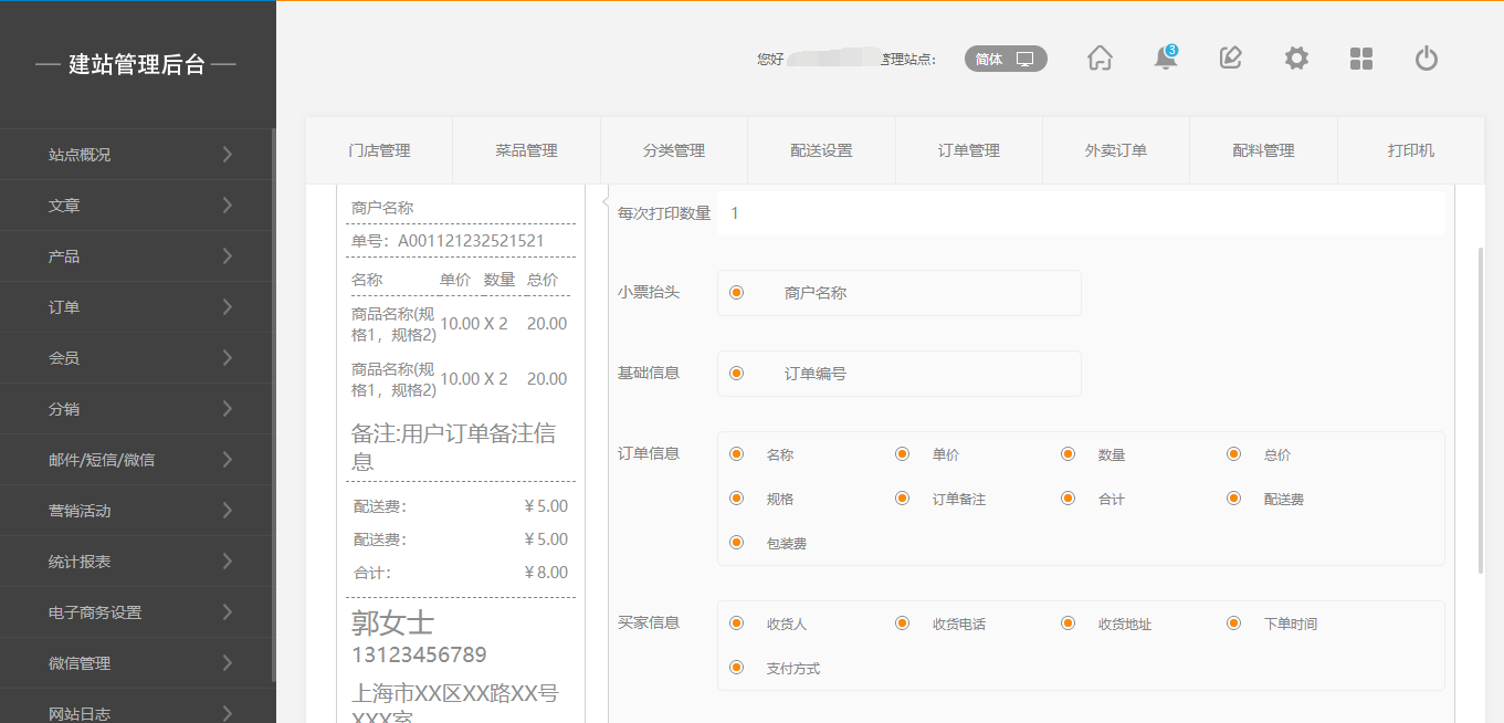 3.点击“打印机”,将需要打印的小票信息填写正确,(注:打印机暂时只支持飞鹅打印机,开发者账号及密钥在飞鹅官网申请注册即可),保存后,点击“编辑”按钮,可以对打印的小票进行设置需要的信息显示项,如图所示: