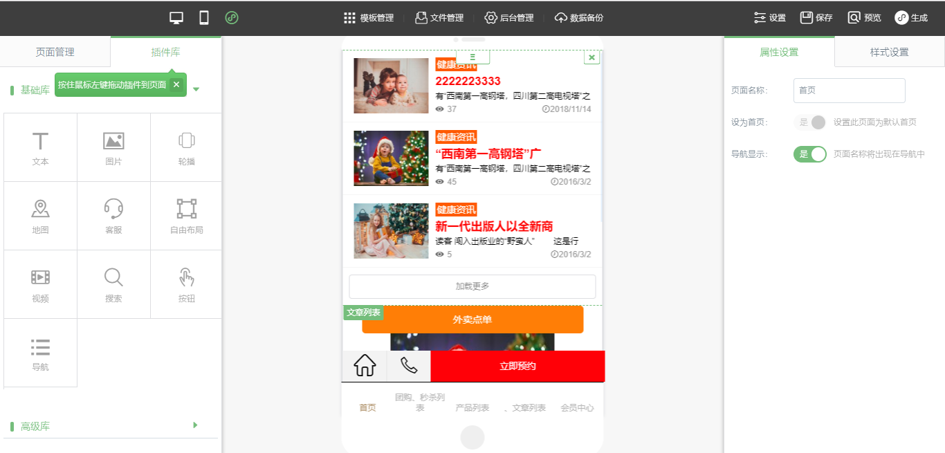 1.在编辑器中,将需要的插件拖入到编辑器中,点击保存,然后点击生成,选择“支付宝”,并点击下载即可,其他操作方式与“支付宝小程序标准版”一致,这里不做赘述,如图所示: